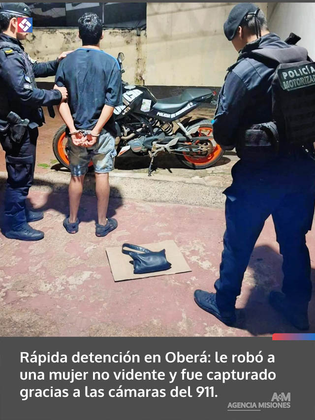 AGENCIA MISIONES.UNO | Un hombre de 27 años con antecedentes penales fue detenido anoche en la ciudad de Oberá, tras haber asaltado a una mujer no vidente de 42 años en plena vía pública. El delincuente abordó a la víctima, quien se encontraba acompañada por su hijo menor, y tras un forcejeo le sustrajo la cartera para luego darse a la fuga por las calles céntricas de la localidad.